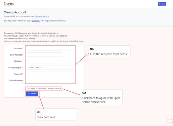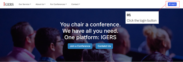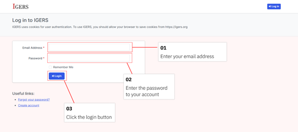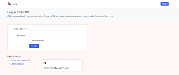 1. To create an account, go to igers.org/login or click the Login button in the top-right corner of the homepage. You will then be redirected to the login page.